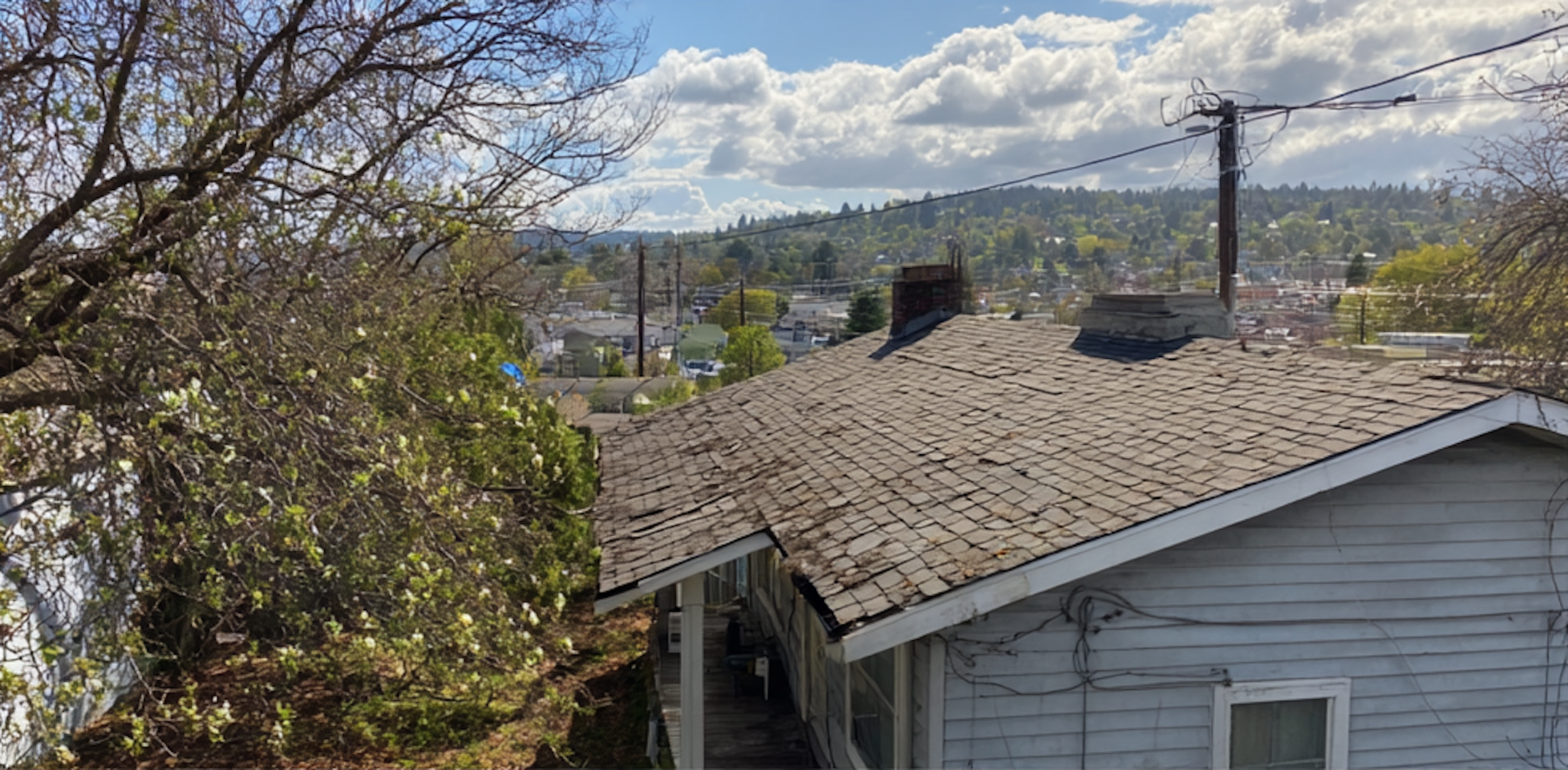 - Missing shingles, sagging areas, or exposed wood